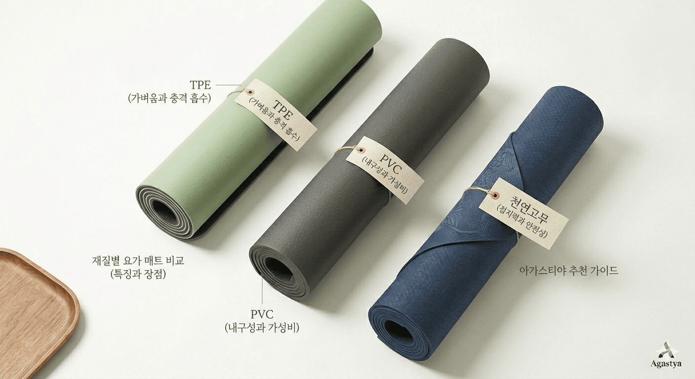 이에 대한 대안인 TPE(Thermoplastic Elastomer)는 고무와 플라스틱의 성질을 동시에 가진 소재입니다. 관련 보건 자료에 의하면 TPE는 PVC보다 무게가 가벼워 휴대성이 좋고 충격 흡수력이 우수하여, 초보 수련자들이 무릎이나 손목 관절을 보호하는 데 보탬이 될 수 있는 것으로 보고됩니다. 저는 좁은 운전석 옆에 가볍게 챙겨 다니기 좋아 TPE 매트를 자주 활용하곤 합니다. 수분을 흡수하지 않아 위생 관리가 용이하지만, 고온에 노출될 경우 변형될 수 있으므로 보관 시 주의가 필요합니다.
